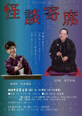 8/4(土)18時開場、18時30分開演 [会場]アイプラザ一宮 [出演]雷門幸福(落語家)、旭堂鱗林(講談師) [入場料]一般1,300円、シニア1,000円、学生700円 [定員]150名 [前売券販売場所]アイプラザ一宮フロントにて販売中。 ※電話予約も可。※先着順。 ★怪談をテーマとした寄席を開催します。