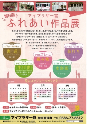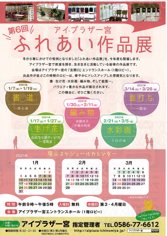 開催中~2021年3月26日(金)9時~17時 場/アイプラザ一宮・エントランスホール(1階ロビー) (一宮市若竹3丁目1-12) アイプラザ一宮を利用しているサークル・団体の作品展示です。 水彩画(2/21~3/5)や能面(3/14~3/26)などのバラエティ豊かな作品が展示されます。 この機会に、ぜひご覧ください。 ◆料金/無料 ◆休館日/第3・4月曜日 問合/アイプラザ一宮 tel. 0586-77-6612