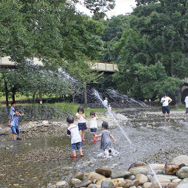 ウッドデッキ周辺では「森のハンモック広場」、「虹の中で水遊び」など夏ならではの催しが満載。