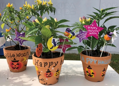 [日時]10月27日(日)(1)10時~12時(2)13時~15時 [場所]クリスタルフラワー入口横 ◎内容/カラフルなとうがらしの苗を植えた鉢に、 イラストやハロウィンピックを飾り付けてハロウィンポットを作ります。 ◎料金/500円 ◎定員/各回先着30個 ◎申込/当日、各回10分前から受付