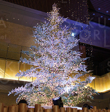 天井から降りそそぐような星の煌めき、その下には美しく雪化粧され温かな光を放ちそびえ立つ本物のもみの木のクリスマスツリー。