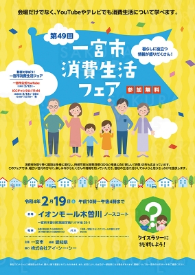 2月19日(土) 10時~16時 イオンモール木曽川(一宮市木曽川町黒田 字南ハツケ池25-1) 消費生活団体や企業・行政団体などによる展示やクイズラリーなど、楽しみながら消費生活について学ぶことができます。また会場だけでなく、市公式YouTubeチャンネルやケーブルテレビICCで「動画で学ぼう! 一宮市消費生活フェア」を放送します。