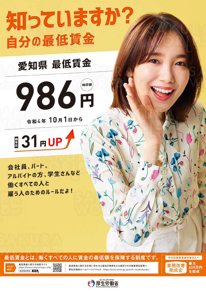 愛知県最低賃金が時間額986円に 改定されました