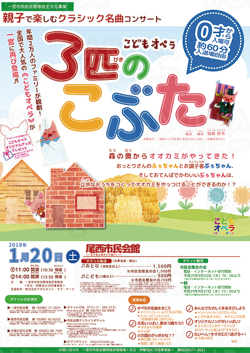 全国で大人気の「こどもオペラ」が一宮にやってくる!今回はゆかいな、こぶた3兄弟の音楽物語。