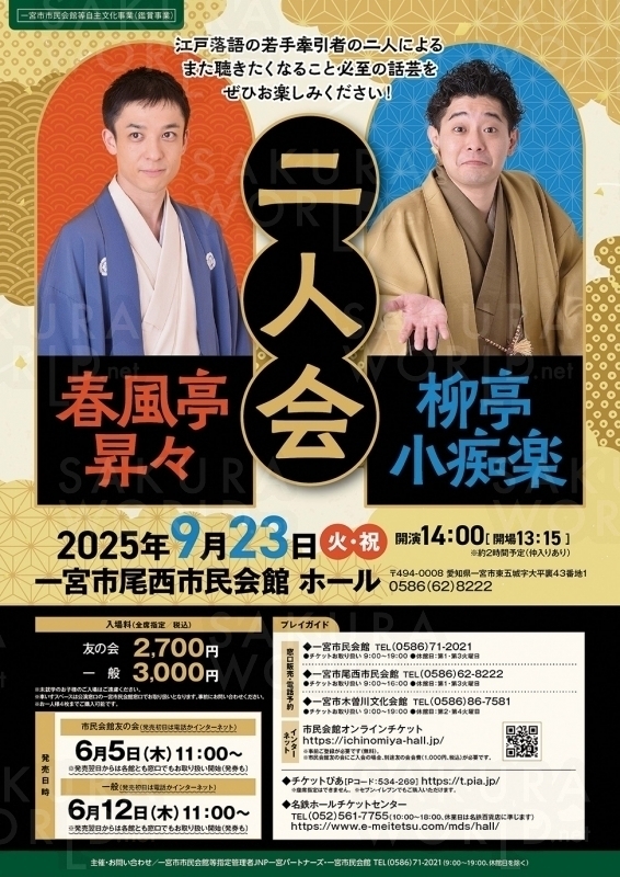 [時]14時開演(13時15分開場) [所]一宮市尾西市民会館 (一宮市東五城字大平裏43-1) - - - - - - - - - - - - - - - - - - - - - - - - - - - - - - - - 江戸落語の若手牽引者の二人による、また聴きたくなること必至の話芸をぜひお楽しみください! ※車いすスペース利用時は事前に公演窓口の一宮市民会館までお問合せください。