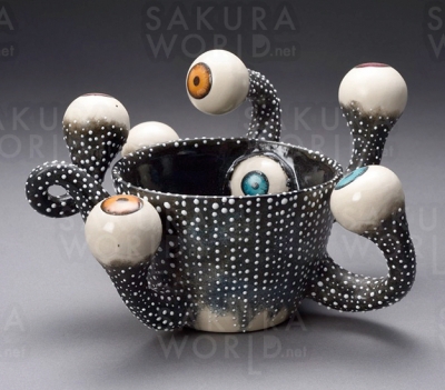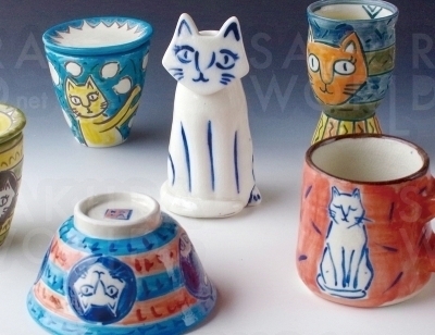 猫のオブジェ、花器、ロボットや動物などを描いた日常の器、蓋物等を展示。