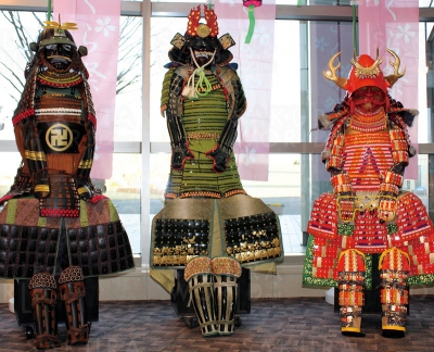 エントランスホールに戦国武将の鎧兜(甲冑)と武者飾りを設置します。