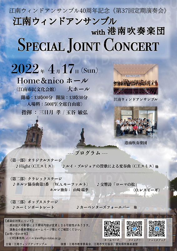 4月17日(日) 13時30分開演 Home&nicoホール江南市民文化会館 大ホール(江南市北野町川石25-1) 江南市で活動を始めて今年で創立40周年を迎える市民吹奏楽団。今回は名古屋市港区の「港南吹奏楽団」とのジョイントコンサートです。交響詩「ローマの松」、カーペンターズメドレー、ユーミンメドレーなど多彩なジャンルの曲を披露します。 ◆料金/500円(全自由席・小学生以下無料)