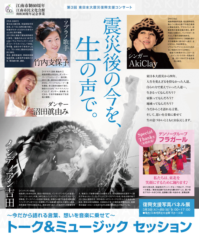 3/8(日)13時30分開演 場所/江南市民文化会館小ホール 出演/インディアン吉田、竹内支保子、沼田眞由み、AkiClay 全席指定/1500円(小学生以下無料) 前売券販売中