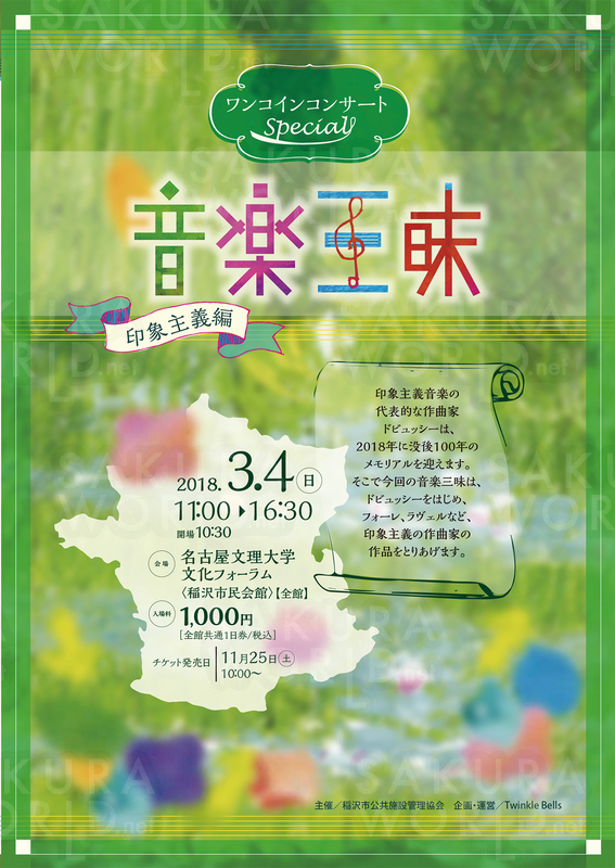 3/4(日)11時~16時30分(開場10時30分) [会場]名古屋文理大学文化フォーラム全館 [入場料]全館共通1日券1,000円 チケット/名古屋文理大学文化フォーラム・チケットぴあ・ローソンチケット他で好評発売中。 [その他]1歳以上は有料です。1歳未満でも、席の必要な方は有料となります。 印象主義といわれる時代の作品や作曲家に焦点を当てた、「音楽三昧」。 館内全施設を使用し、様々な音楽イベントやお子様も楽しめるアトラクションを開催。