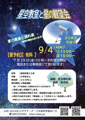 天文研究家 浅田 英夫氏による星空教室、そして教室参加者とその家族を対象とした「星の観望会」(19時30分~)を開催します。