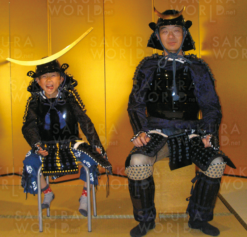 よろい・かぶとを大人用1領と子供用2領、サイズ別に5着取り揃えた陣羽織などを用意。