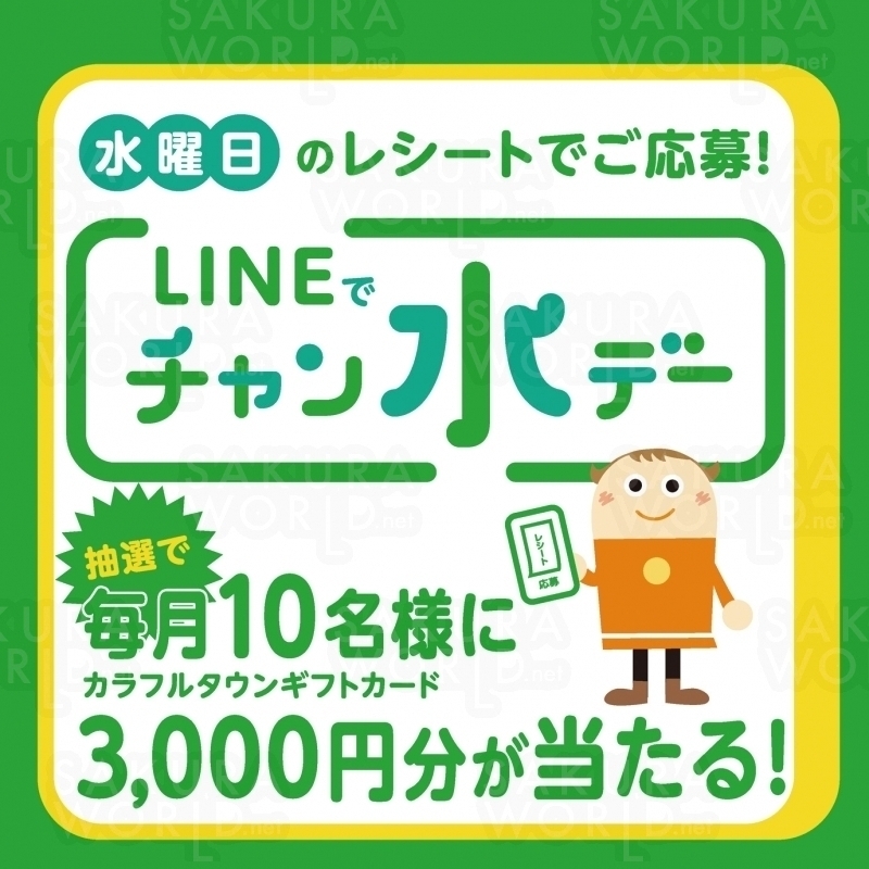 カラフルタウン岐阜(岐阜市柳津町丸野3-3-6) 毎月10名様にカラフルタウンギフトカード3,000円分が当たる“LINEでチャン水デー” 水曜日のお買い上げレシート1,000円以上のレシート写真1枚を添付して応募しよう! (カラフルタウン館内水曜レシート、毎月15口まで)